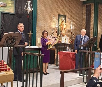 El Martes 5 de noviembre tuvo lugar la celebración de la XXII edición de la tradicional exaltación a Santa Ángela de la Cruz cotitular de nuestra Hermandad, que en esta ocasión corrió a cargo de Pepa Medina Rodríguez de la Hermandad del Nazareno de Algeciras, siendo presentada por nuestro hermano Juan José Andrades Azorit. Tras una celebración Eucarística presidida por el Rvdo Padre D. Antonio Jesús López director espiritual de nuestra Hermandad y Párroco de la de San Antonio, cargada de bonitos instantes acompañados por la Coral Ars Morientis, precedió a unas palabras llenas de cariño, emotividad, sinceridad y un profundo sentimiento de AMOR a Santa Ángela de la Cruz, de la exaltadora este año, Pepita Medina Rodríguez. Fue presentada por nuestro hermano Juan Jose Andrades Azorit , el cual con la suma elegancia y buen hacer que atesora, supo dar paso a las cálidas palabras de Pepita, cargadas de momentos personales e íntimos con “Madre Angelita” como cariñosamente la llama en sus momentos de diálogos con la misma. Un repaso por su devoción a la Santa desde que apareció en su vida, repleta de historias donde la presencia de la zapaterita, hizo emocionar a los que tuvimos la suerte de acudir, a pesar de las inclemencias del tiempo que protagonizaron la tarde. Felicidades y enhorabuena por hacernos sentir la devoción que procesa a nuestra exaltadora. Al final de la exaltación les fue entregado por el Vice-Hermano Mayor de la Hermandad, sendos cuadros con la imagen de Santa Ángela a la exaltadora y a su presentador. Asistieron, el presidente del Consejo Local Nicolás Fernández Arjona, el presidente de la Tertulia Cofrade “La Levantá”, Manuel López Arcas, así como hermanos mayores y representantes de las distintas hermandades y Cofradías de la ciudad. Además de un gran número de cofrades que a pesar del mal tiempo acudieron al acto. |